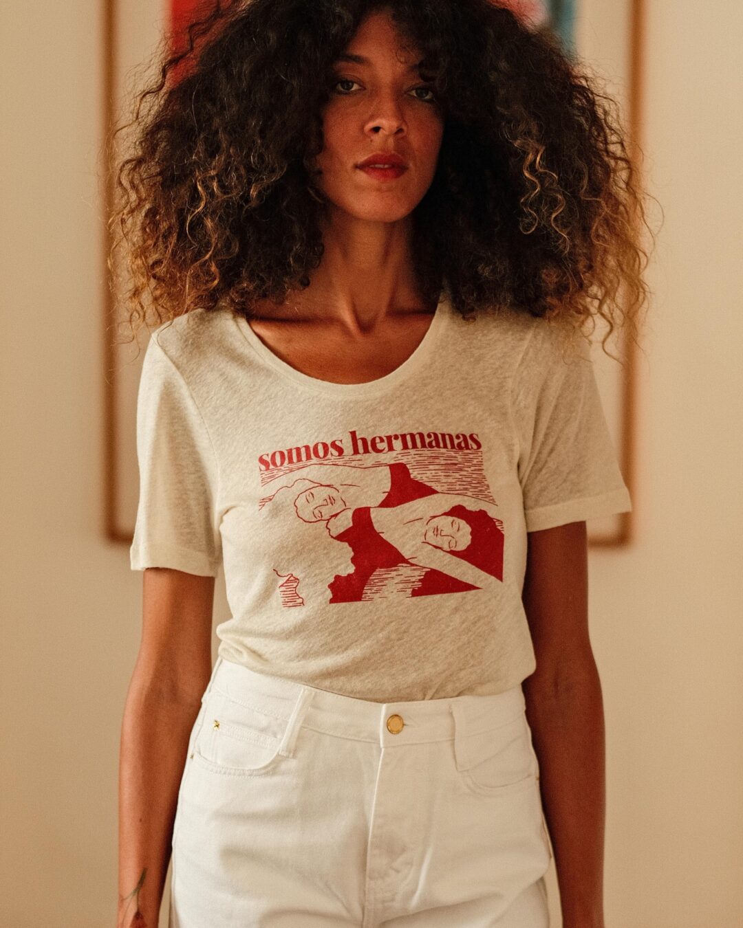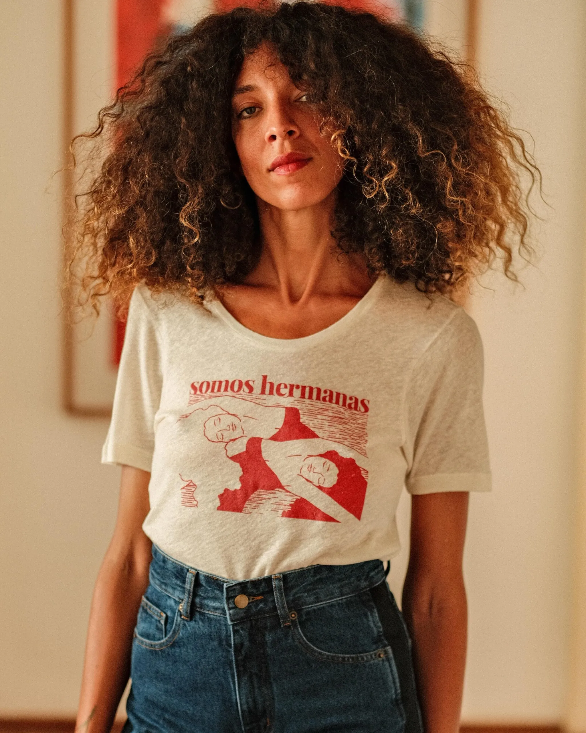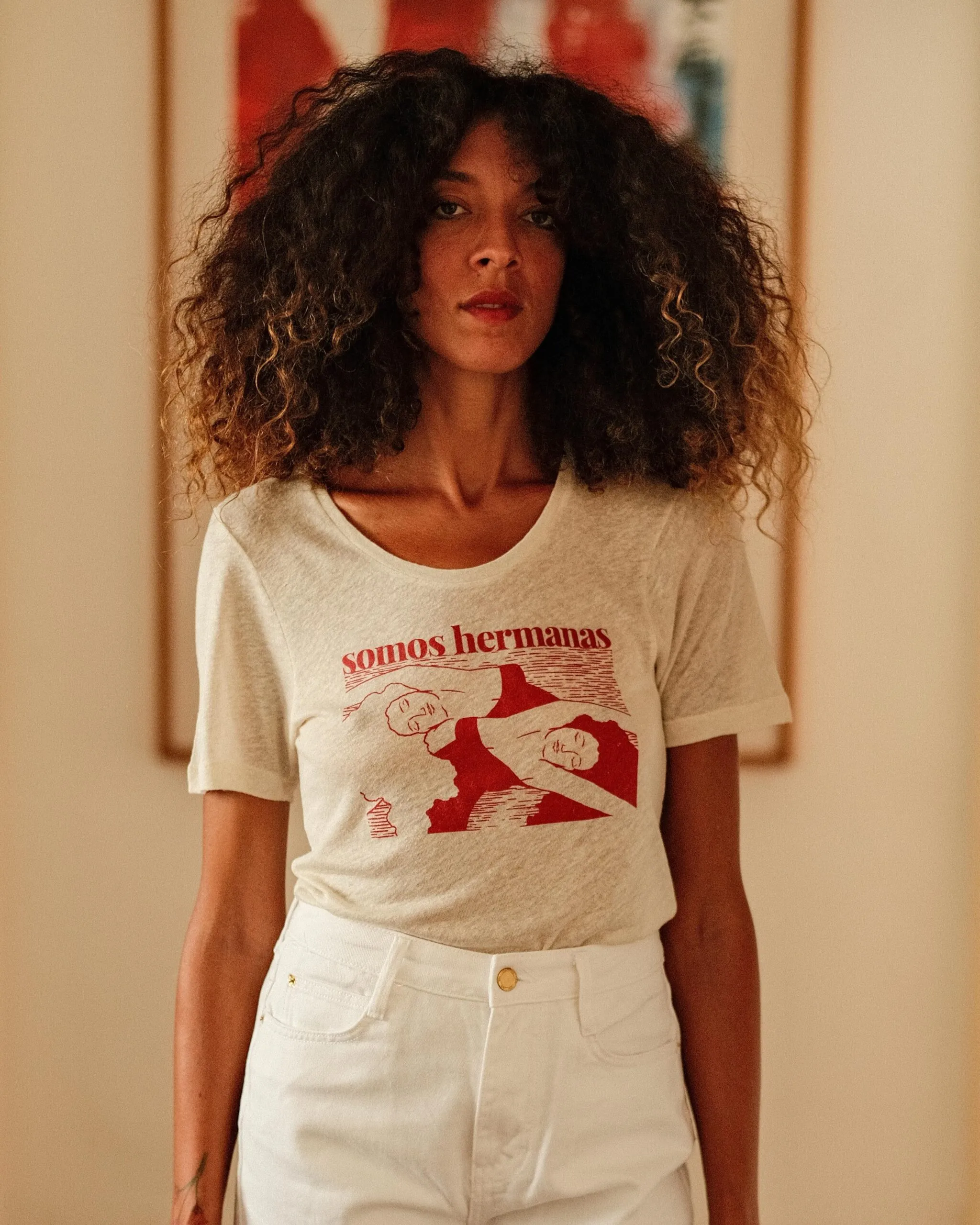 Camiseta em malha de linho com estampa e modelagem soltinha.