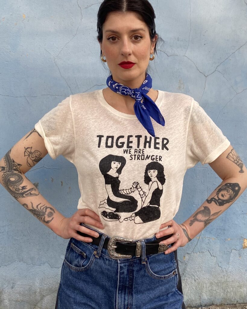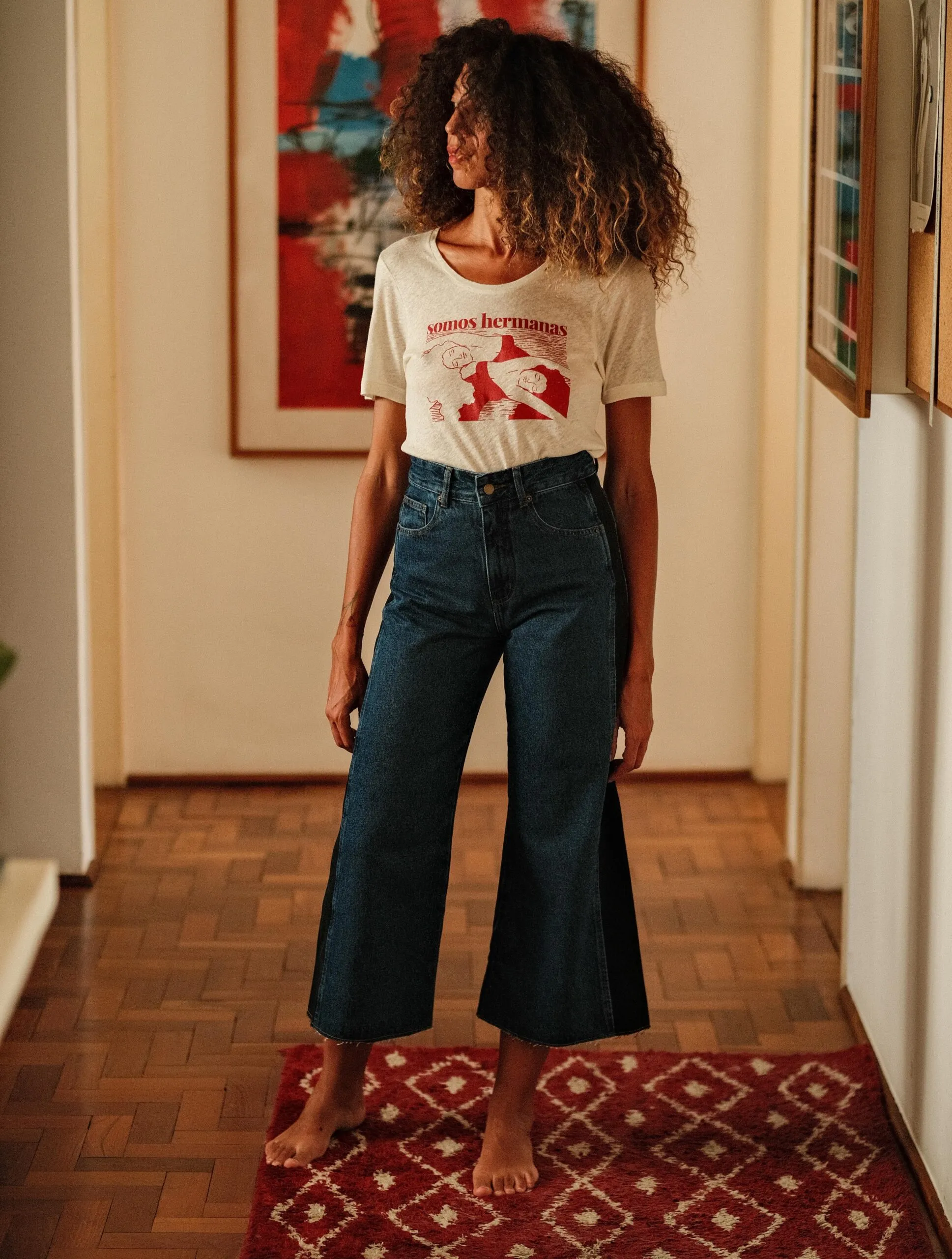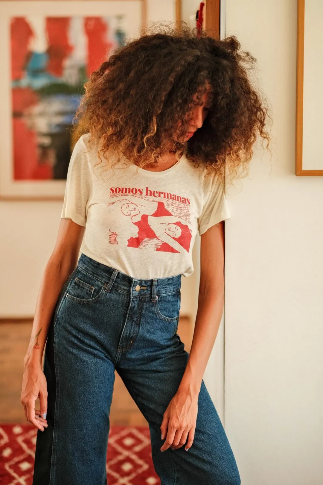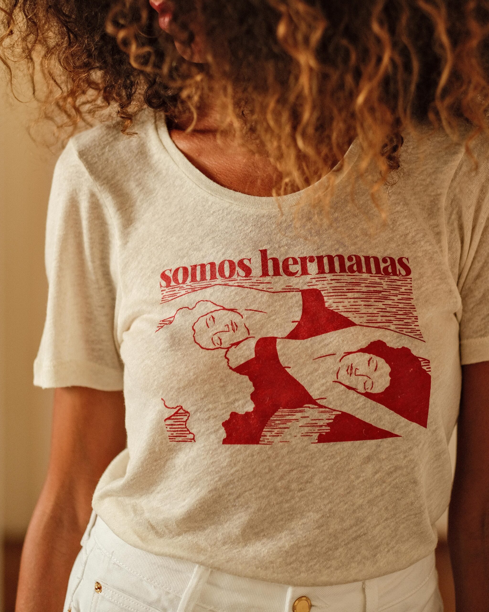 Camiseta em malha de linho com estampa e modelagem soltinha.