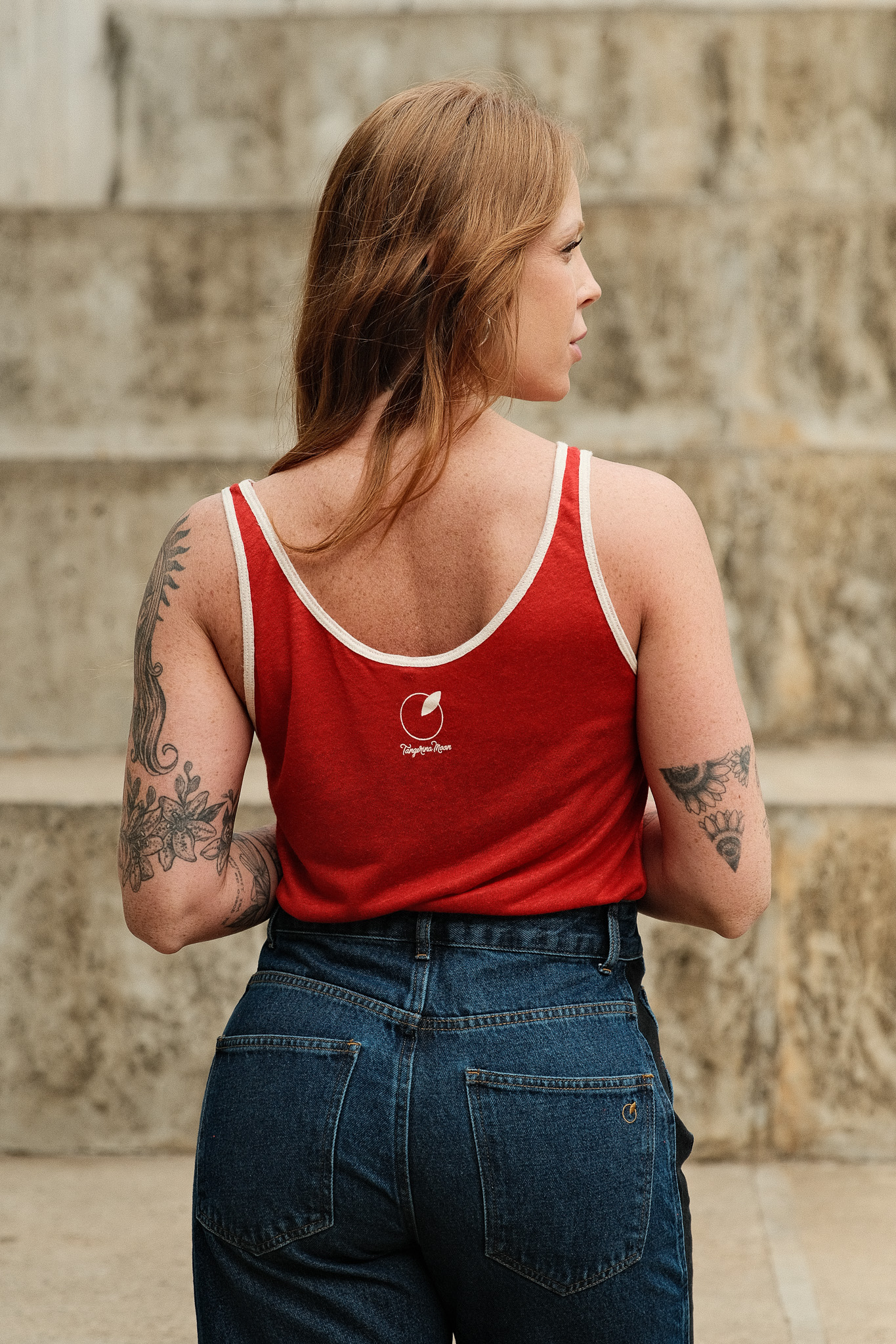 Regata em malha de linho com estampa, debrum na cor Off White e modelagem soltinha.